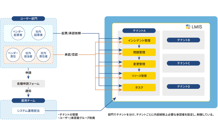 その過程で注目したのが、ITIL準拠のサービスマネジメントプラットフォーム「LMIS」でした。「評価対象となる業務システムを運用する被評価者側で『LMIS』を利用した経験があり、IT統制の強化に向けた基盤として信頼できるという声がありました」と大田氏は振り返ります。変更管理やリリース管理を利用したシステム変更の証跡管理が可能なだけでなく、自社と協力ベンダーが同じ情報にアクセスし、それぞれ進捗を確認できるところも好評でした。数年前までは関係会社で被評価側の立場だった大田氏は、「LMIS」の管理体系であれば過年度の情報も含めて容易に把握できるなど、利用者の立場としてもメリットが得られると考えたのです。